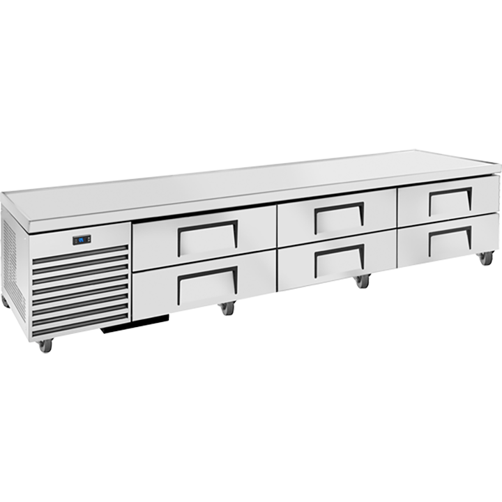 6-drawer refrigerated chef base with reinforced stainless steel top supporting up to 2000 lb. Maintains 33–38°F; each drawer holds 2 full-size 12″x20″x4″ pans.