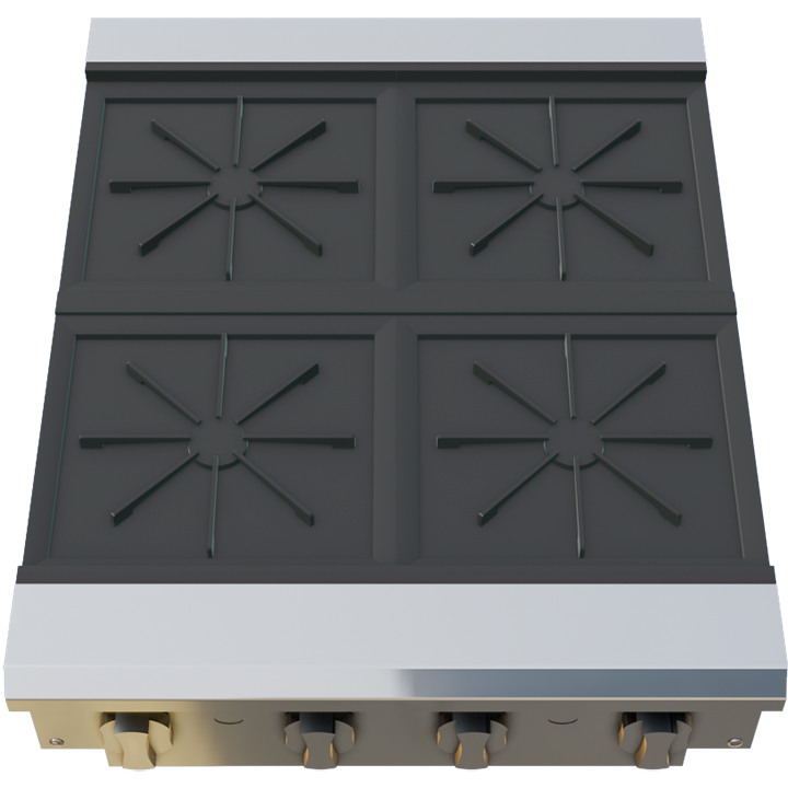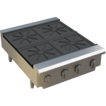 24-inch countertop hot plate with 4 cast iron burners rated at 30,000 BTU each (120,000 BTU total). Features heavy-duty 12″x12″ top grates, manual burner controls, protected standing pilots, stainless steel crumb pan, and adjustable legs.