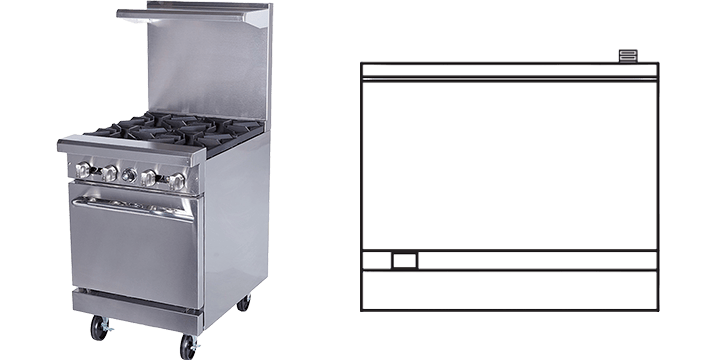 24-inch gas range with full griddle top featuring 2 burners (20,000 BTU each) and one standard oven with a 27,000 BTU U-burner. Total output 67,000 BTU. Built with stainless steel front and sides, polished steel griddle plate, and heavy-duty cast iron components.