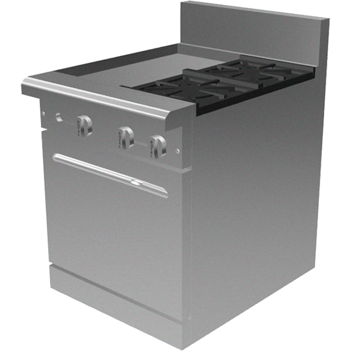 24-inch gas range with 2 open burners (30,000 BTU each), 12-inch griddle with one 20,000 BTU burner, and one standard oven with a 27,000 BTU U-burner. Total output 107,000 BTU. Stainless steel construction with cast iron grates and heavy-duty lift-off burner heads.