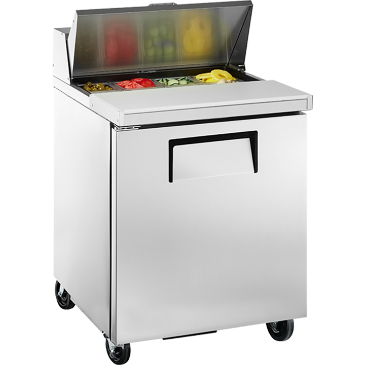 27-inch refrigerated prep unit with 1 solid swing door, 8 pan top capacity, and a full-length cutting board. Maintains 33–41°F for fresh sandwich and salad preparation.