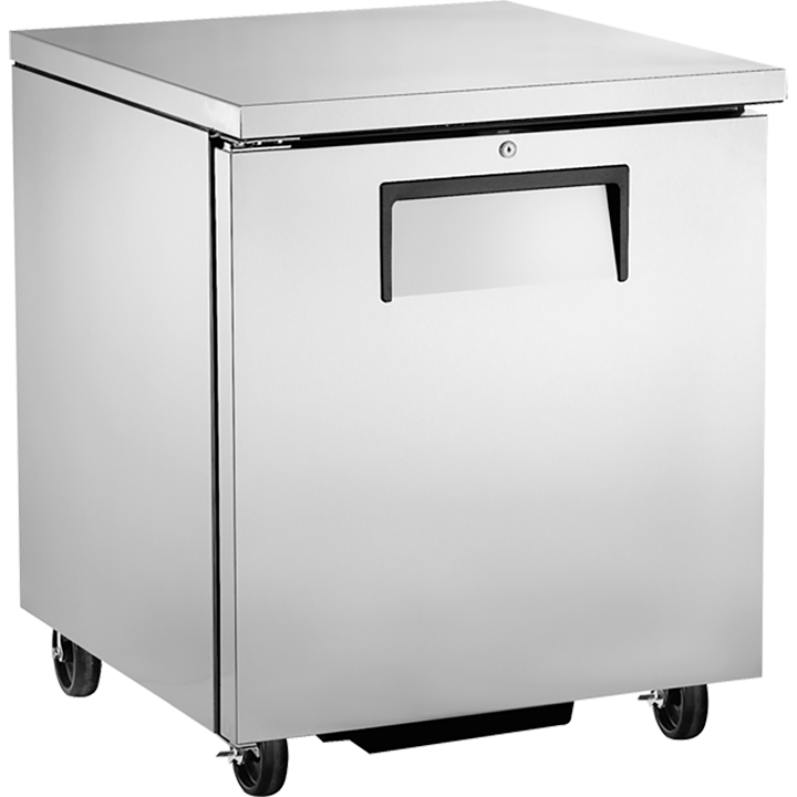 1-door undercounter freezer maintaining -10°F for frozen foods and ice cream, featuring a 27-inch-wide stainless steel cabinet with a solid swing door for durable, space-saving cold storage.