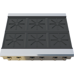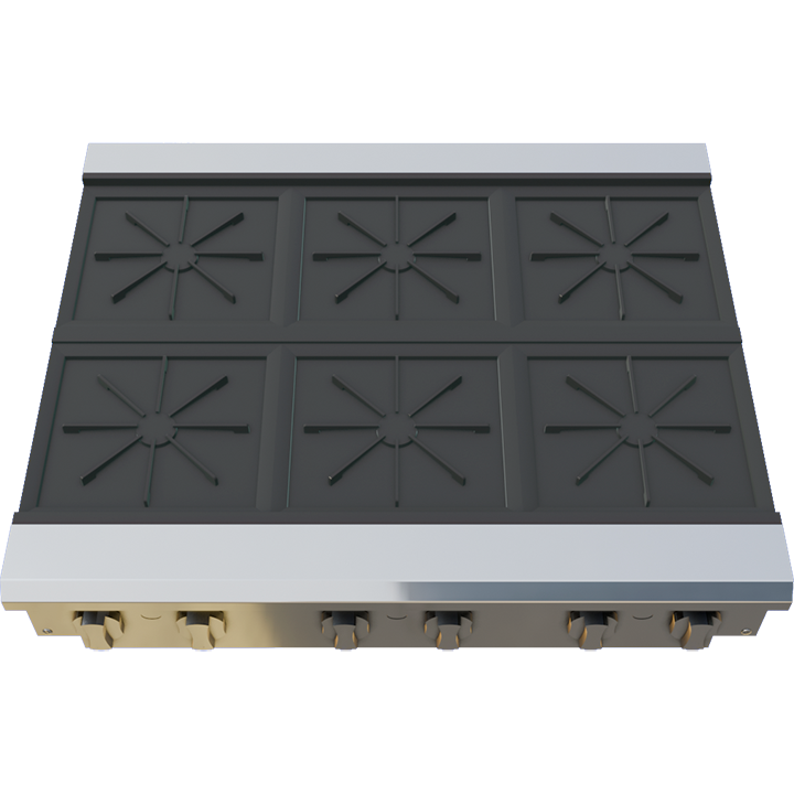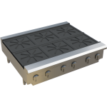 36-inch countertop hot plate with 6 cast iron burners rated at 30,000 BTU each (180,000 BTU total). Includes heavy-duty 12″x12″ top grates, manual burner controls, protected standing pilots, stainless steel crumb pan, and adjustable legs.