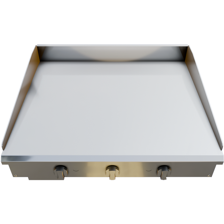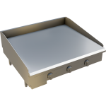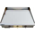 36-inch countertop gas griddle with 3 stainless steel U-shaped burners delivering 90,000 BTU total. Built with a 3/4″ thick polished cooking plate, manual burner controls, stainless steel body, 4″ grease trough with drain, and adjustable heavy-duty legs.