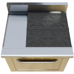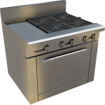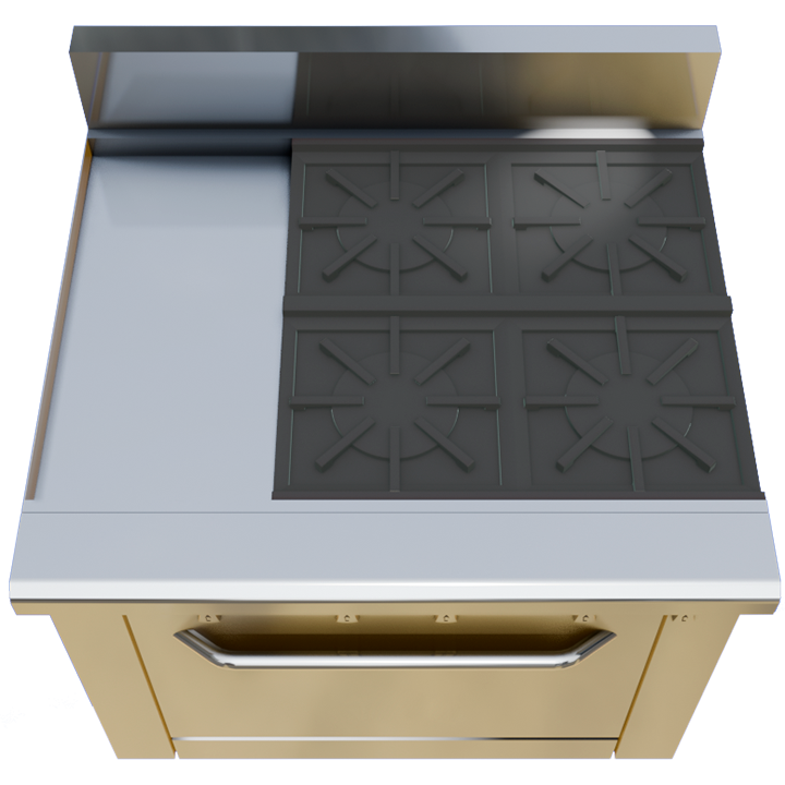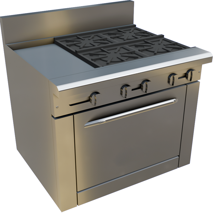 36-inch gas range with 4 open burners (30,000 BTU each), 12-inch griddle with one 20,000 BTU burner, and one standard oven with a 35,000 BTU U-burner. Total output 175,000 BTU. Built with stainless steel front and sides, cast iron grates, and heavy-duty lift-off burner heads.
