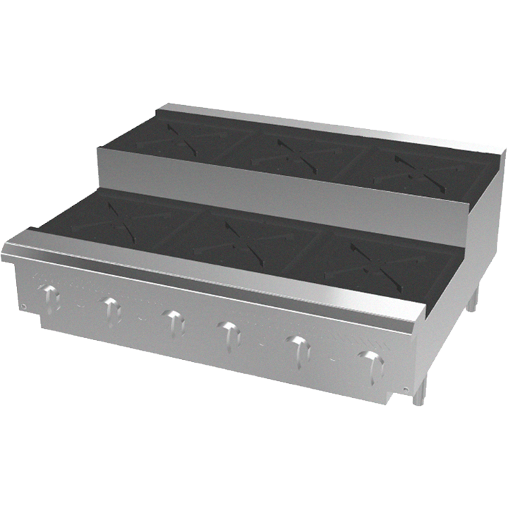 Six open burners delivering 180,000 BTU total output with rear burners elevated 4″, heavy cast iron grates, and stainless steel construction for durability and easy cleaning.