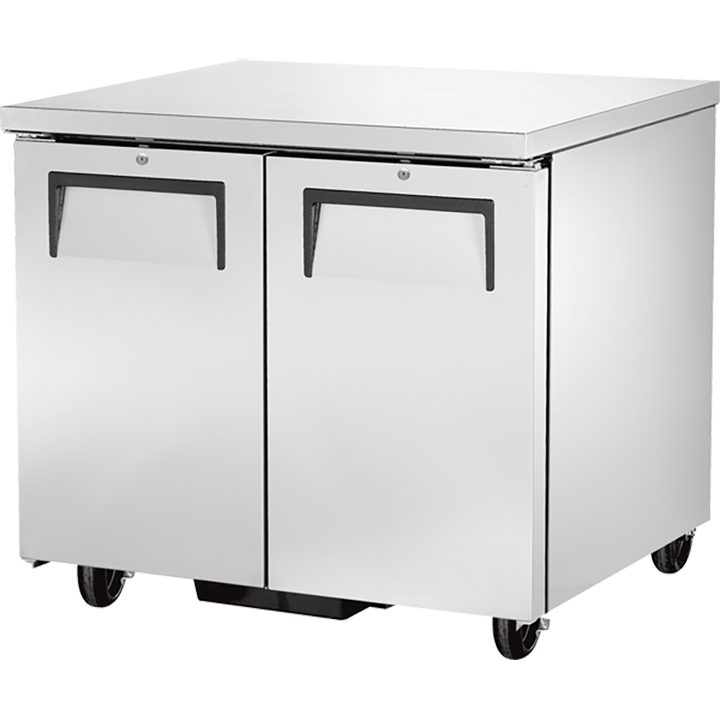 2-door undercounter refrigerator maintaining 33–38°F for reliable food preservation, featuring solid swing doors and a 36-inch-wide stainless steel cabinet for compact, durable performance.