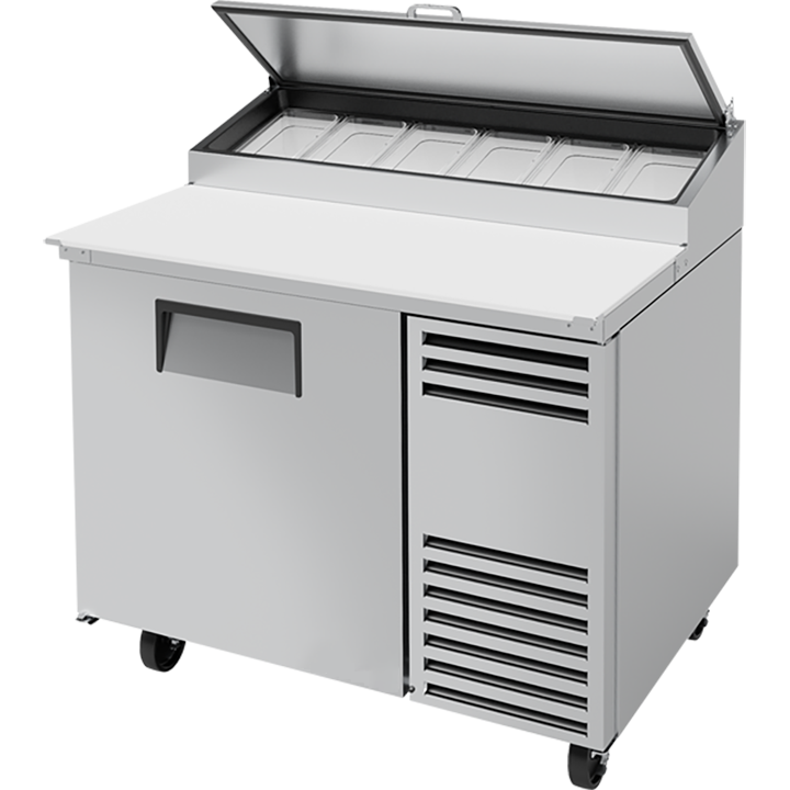 44-inch refrigerated prep table with 1 solid door, 6 pan capacity, and a full-length cutting board for pizza preparation. Includes 2 adjustable shelves.