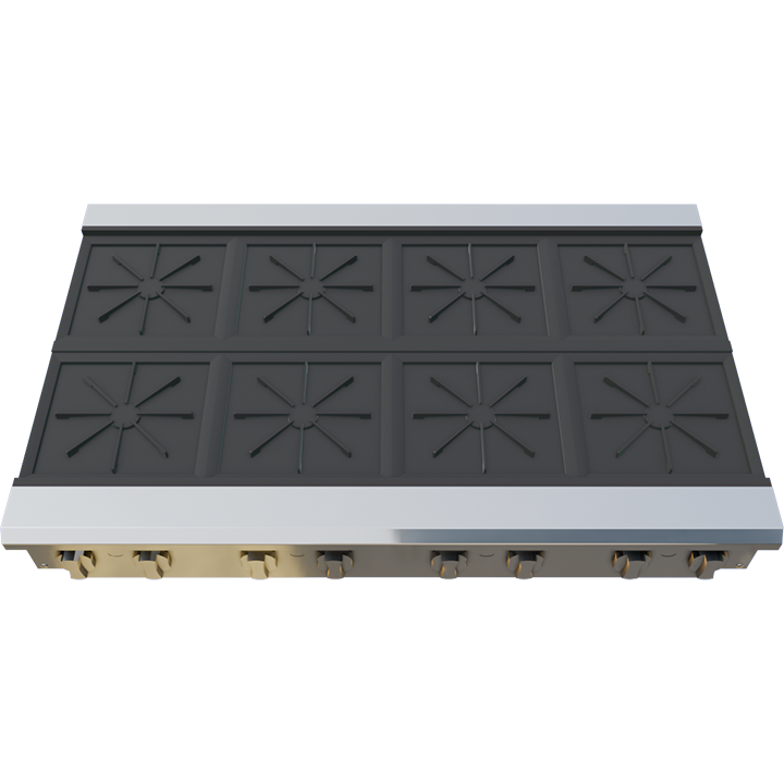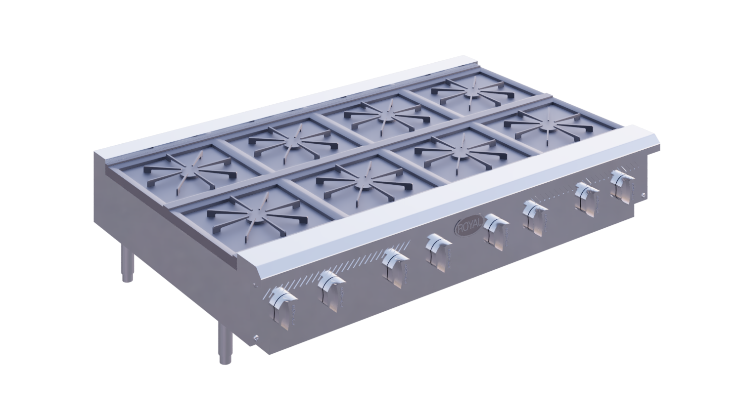 48-inch countertop hot plate with 8 cast iron burners rated at 30,000 BTU each (240,000 BTU total). Features heavy-duty 12″x12″ top grates, manual controls for each burner, protected standing pilots, stainless steel sides and crumb pan, and adjustable legs.