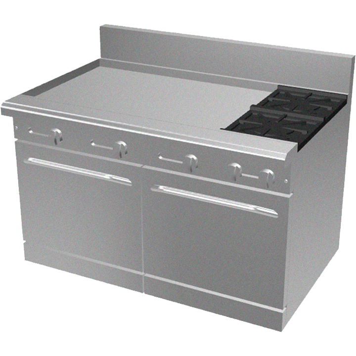 48-inch gas range with 2 open burners (30,000 BTU each), 36-inch griddle with 3 burners (20,000 BTU each), and two standard 20″ ovens with 27,000 BTU U-burners. Total output 174,000 BTU. Stainless steel construction with cast iron grates and heavy-duty lift-off burner heads.