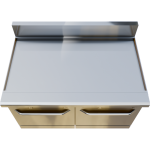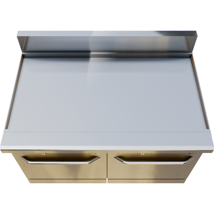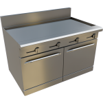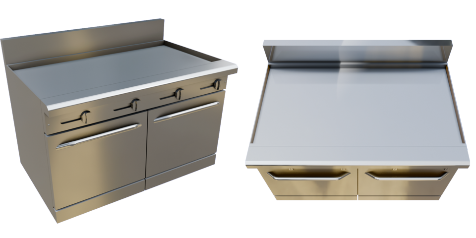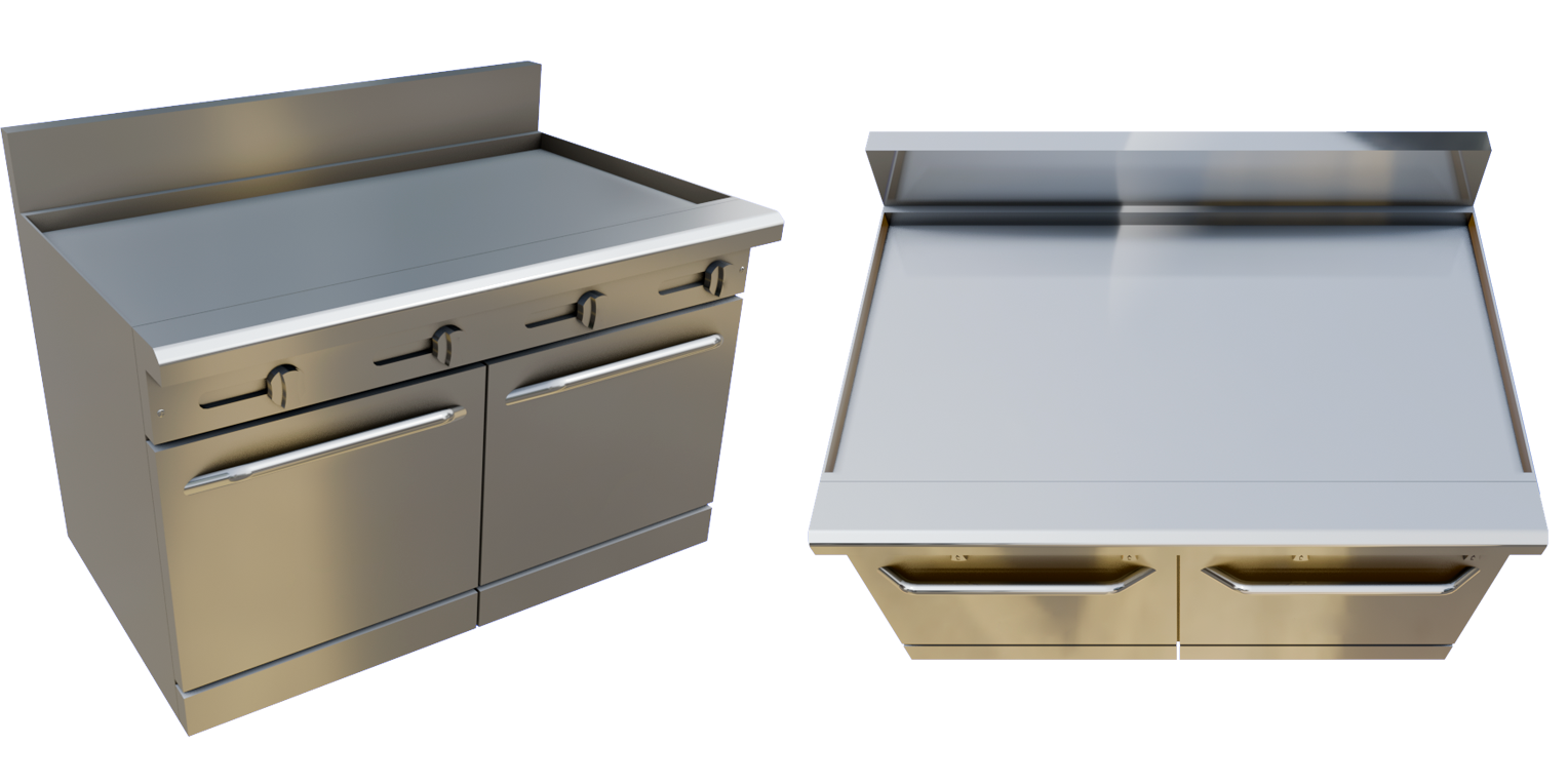 48″ full griddle range (134,000 BTU) with two 27,000 BTU ovens. Includes ¾″ polished steel griddle plate and stainless construction for maximum performance.
