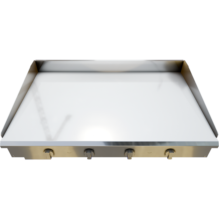 48-inch countertop gas griddle with 4 stainless steel U-shaped burners delivering 120,000 BTU total. Built with a 3/4″ thick polished plate, manual controls, stainless steel construction, 4″ wide grease trough with drain, and adjustable heavy-duty legs.