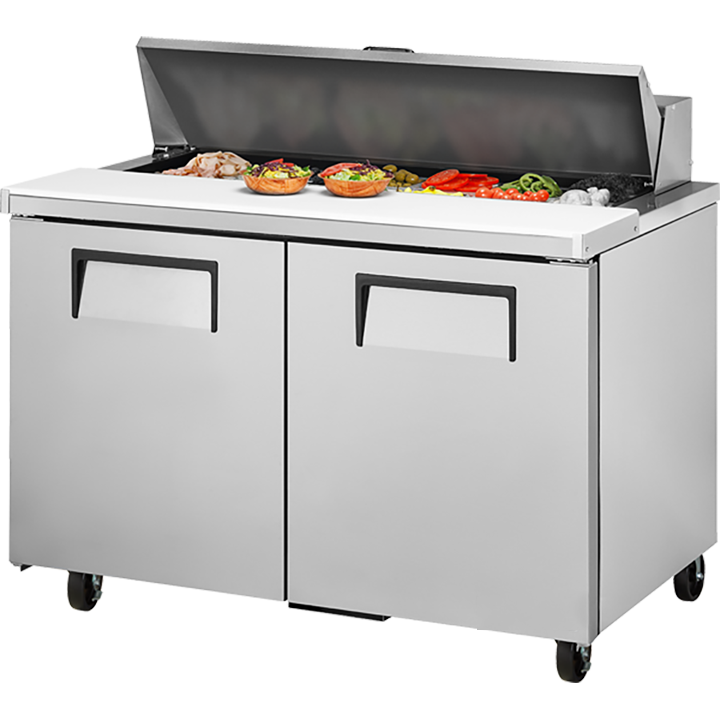 48-inch refrigerated prep table with 2 solid swing doors, 12 pan top capacity, and a full-length 11 3/4″ cutting board. Maintains 33–41°F for fresh sandwich and salad preparation.