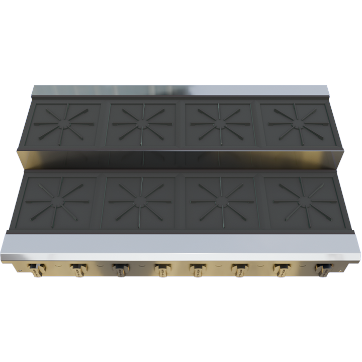 Eight open burners delivering 240,000 BTU total output with rear burners elevated 4″, heavy cast iron grates, and stainless steel construction for durability and easy cleaning.