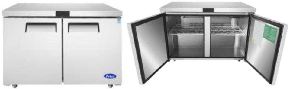 2-door undercounter freezer with stainless steel exterior and interior, reinforced stainless top, and two epoxy-coated shelves. Maintains -8°F to 0°F using electronic temperature control and eco-friendly R290 refrigerant. Features recessed handles, self-closing doors with stay-open function, magnetic gaskets, and pre-installed casters for easy mobility.
