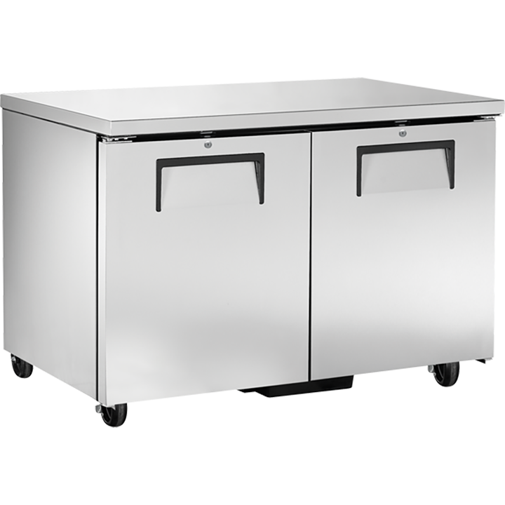 2-door undercounter refrigerator maintaining 33–38°F for reliable food preservation, featuring a 48-inch-wide stainless steel cabinet with solid swing doors for durable and efficient performance.