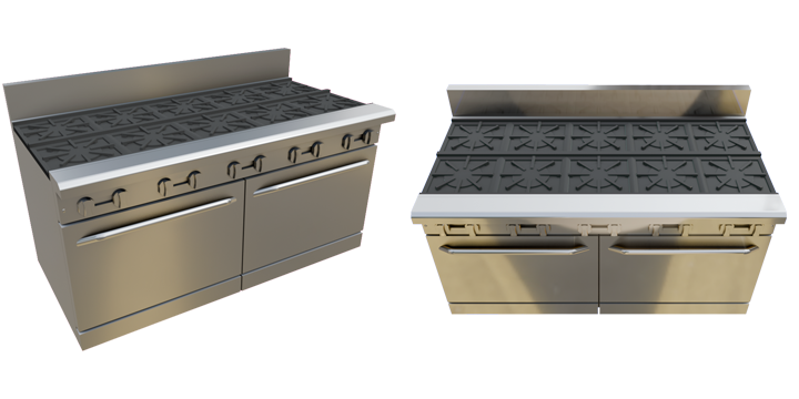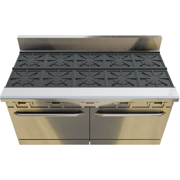 60″ gas restaurant range with 10 open burners (370,000 BTU) and two standard ovens rated at 35,000 BTU/hr each. Stainless front, sides, and high shelf, with heavy-duty cast iron grates and porcelain oven interiors. Designed for high-volume commercial kitchens.