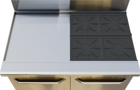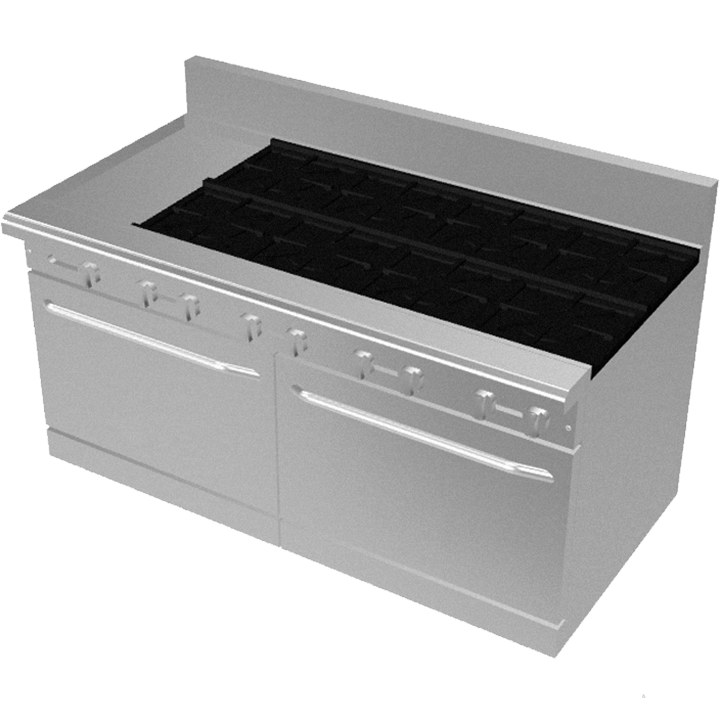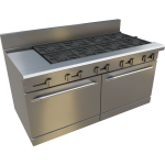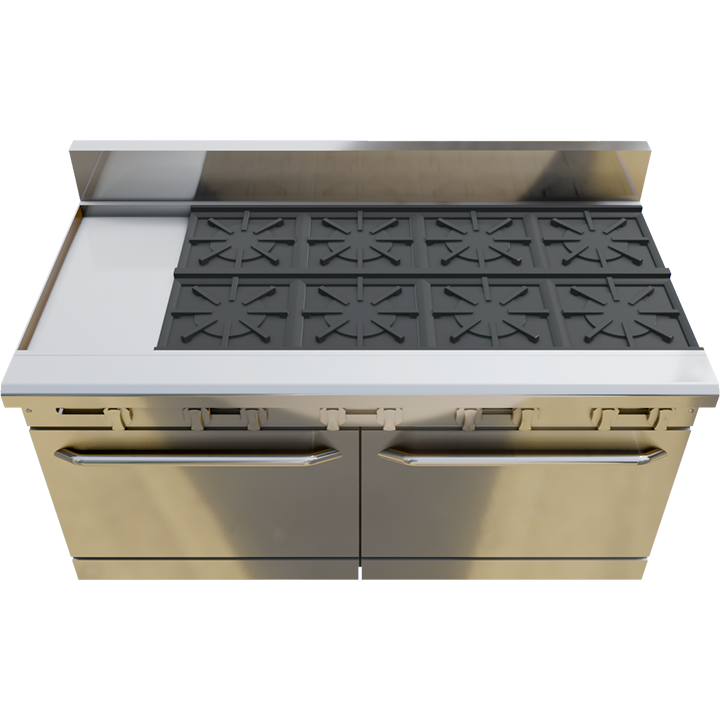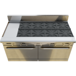 60″ gas restaurant range with 8 open burners and 12″ griddle (330,000 BTU total). Includes two standard ovens rated at 35,000 BTU/hr each, stainless steel front and sides, and ¾″ thick polished steel griddle plate. Designed for high-capacity commercial kitchens.