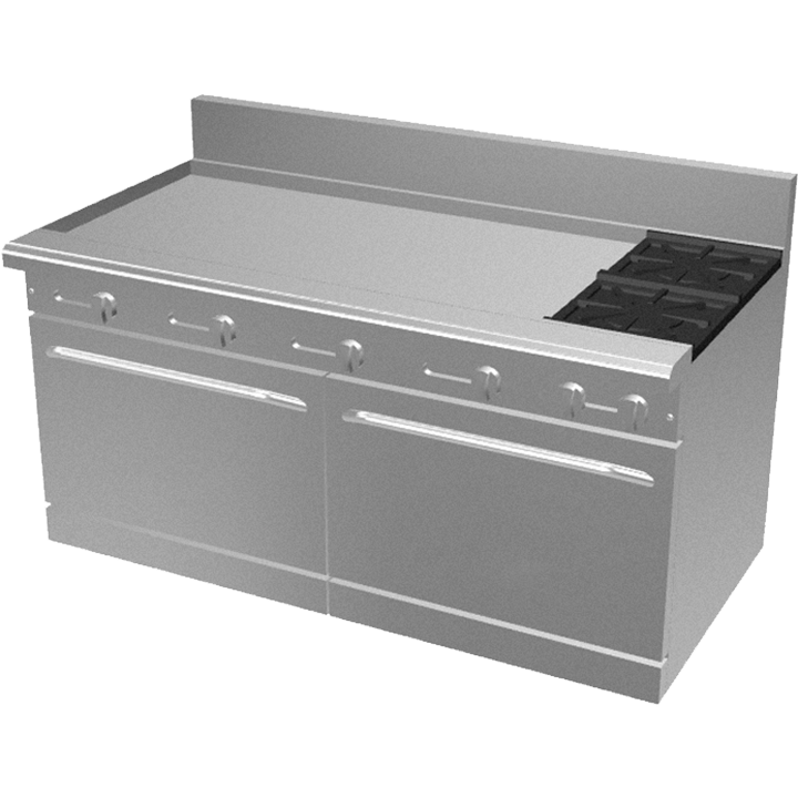 60-inch gas range with 2 open burners (30,000 BTU each), 48-inch griddle with 4 burners (20,000 BTU each), and two 26 1/2″ standard ovens with 35,000 BTU U-burners. Total output 210,000 BTU. Stainless steel construction with cast iron grates and lift-off burner heads.