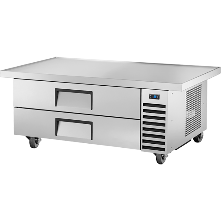 2-drawer refrigerated chef base maintaining 33–38°F for reliable food preservation, featuring a 60-inch-wide heavy-duty stainless steel top supporting up to 717 lbs of countertop cooking equipment, drip-resistant marine edge, and drawers holding up to three full-size pans each.