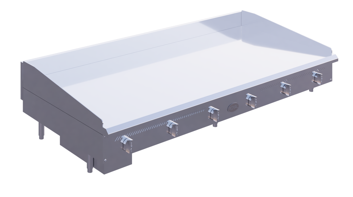 72-inch countertop gas griddle with 6 stainless steel U-shaped burners delivering 180,000 BTU total. Features a 3/4″ thick polished plate, manual controls, stainless steel construction, 4″ grease trough with drain, and adjustable heavy-duty legs.