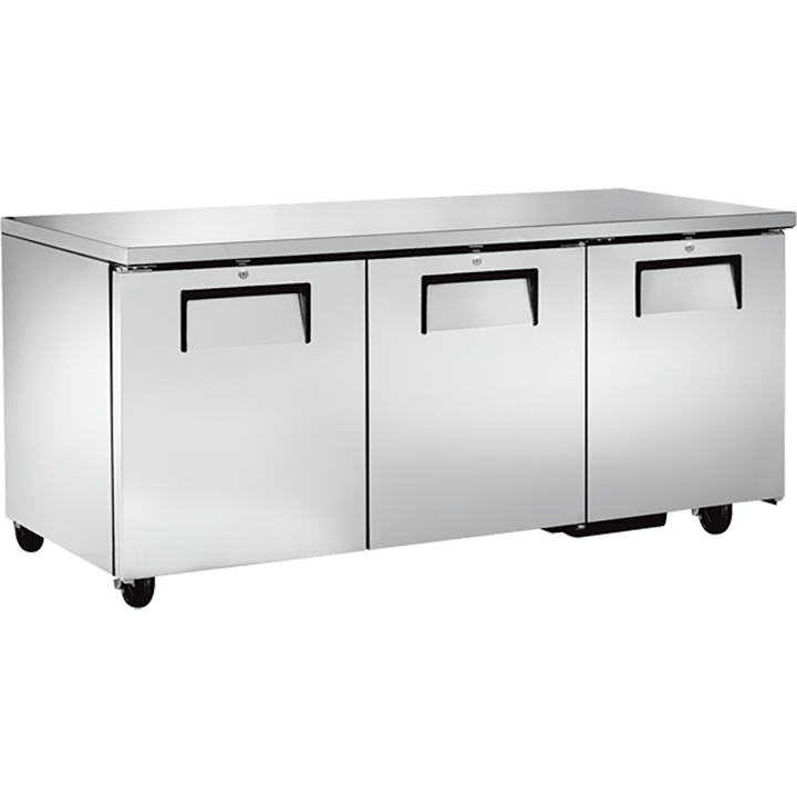 3-door undercounter refrigerator maintaining 33–38°F using R290 hydrocarbon refrigerant, featuring 6 heavy-duty adjustable wire shelves, stainless steel front, top, and ends, and a clear-coated aluminum interior with stainless steel floor.