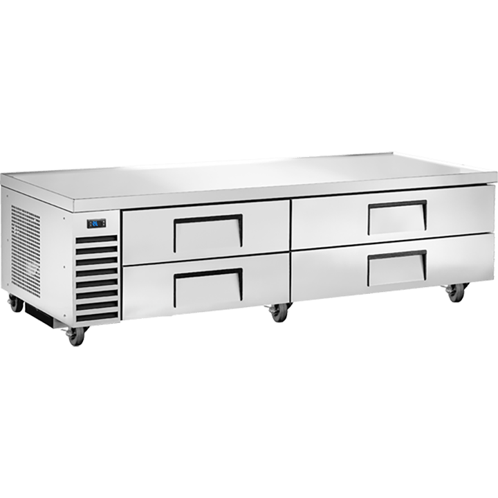 4-drawer refrigerated chef base with heavy-duty stainless steel top supporting up to 1084 lb. Maintains 33–38°F; left drawers hold 3 full-size pans, right drawers hold 2 full-size pans. Features drip-resistant marine edge for added durability.