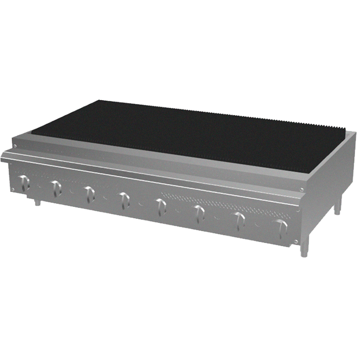 48-inch countertop gas radiant broiler with 8 stainless steel tubular burners rated at 15,000 BTU each (120,000 BTU total). Features heavy-duty cast iron top grates, removable firebox assembly, stainless steel crumb pan, standing pilots, and adjustable 4″ legs.