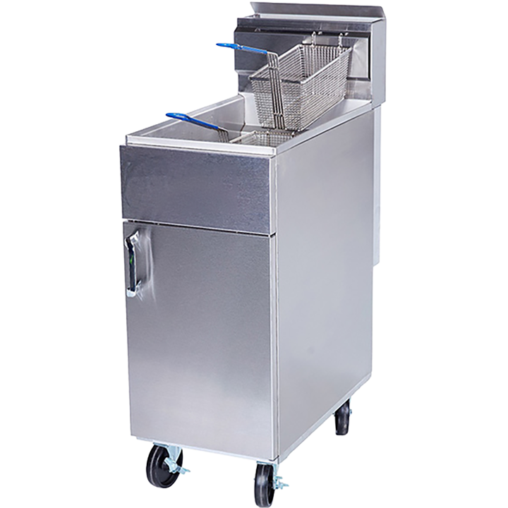 3-burner 50-lb capacity gas fryer delivering 114,000 BTU, featuring a 14″x14″ frying area, thermostatic control (200–400°F), stainless steel tank, 2 fry baskets, and a 1 1/4″ drain valve for easy cleaning.