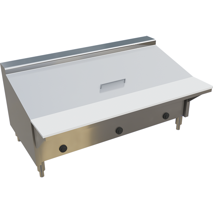 3-well open-base gas hot food table featuring individual 3,500 BTU burners with adjustable gas valves and pilot lights, 8″ cutting board, and stainless steel undershelf for efficient food service operation.