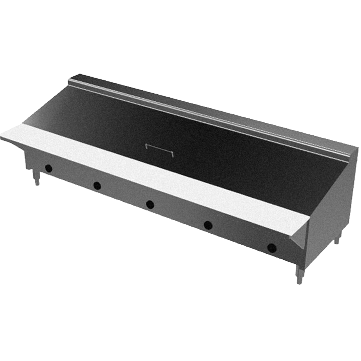 5-well open-base gas hot food table with stainless steel construction and individually controlled 3,500 BTU burners (total 17,500 BTU). Features 8″ deep insulated galvanized wells, adjustable gas valves with pilot lights, full-length poly cutting board, undershelf for storage, and non-marking feet for stability.