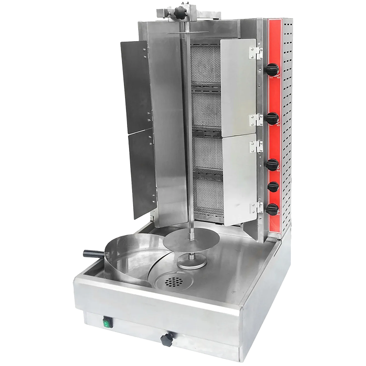 Countertop gas vertical broiler with stainless steel body, 4 independently controlled burners (50,000 BTU/hr total), and adjustable burner panel. Features a heavy-duty 110V motor with 2.5 RPM rotation and sturdy skewer holding over 35 lb of meat. Convertible for natural or propane gas.