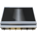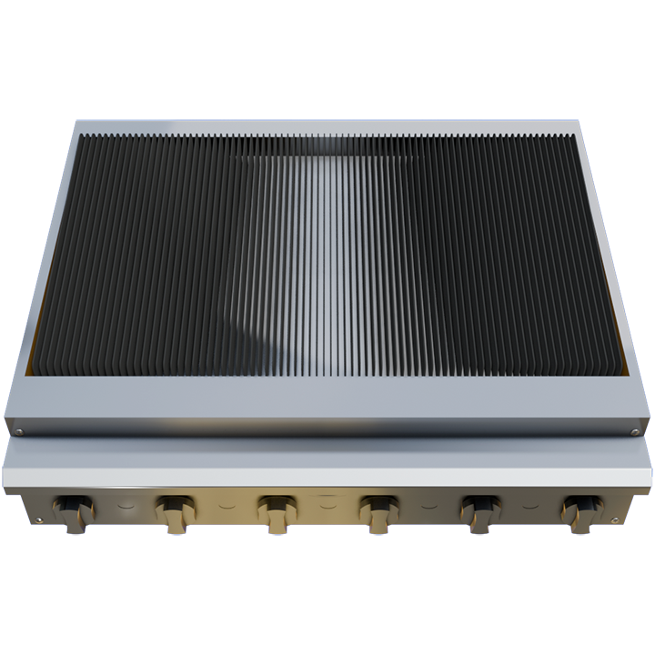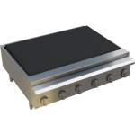 36-inch countertop gas radiant broiler with 6 stainless steel tubular burners rated at 15,000 BTU each (90,000 BTU total). Features heavy-duty cast iron radiant covers and top grates, removable firebox assembly, stainless steel crumb pan, standing pilots, and adjustable 4″ legs.
