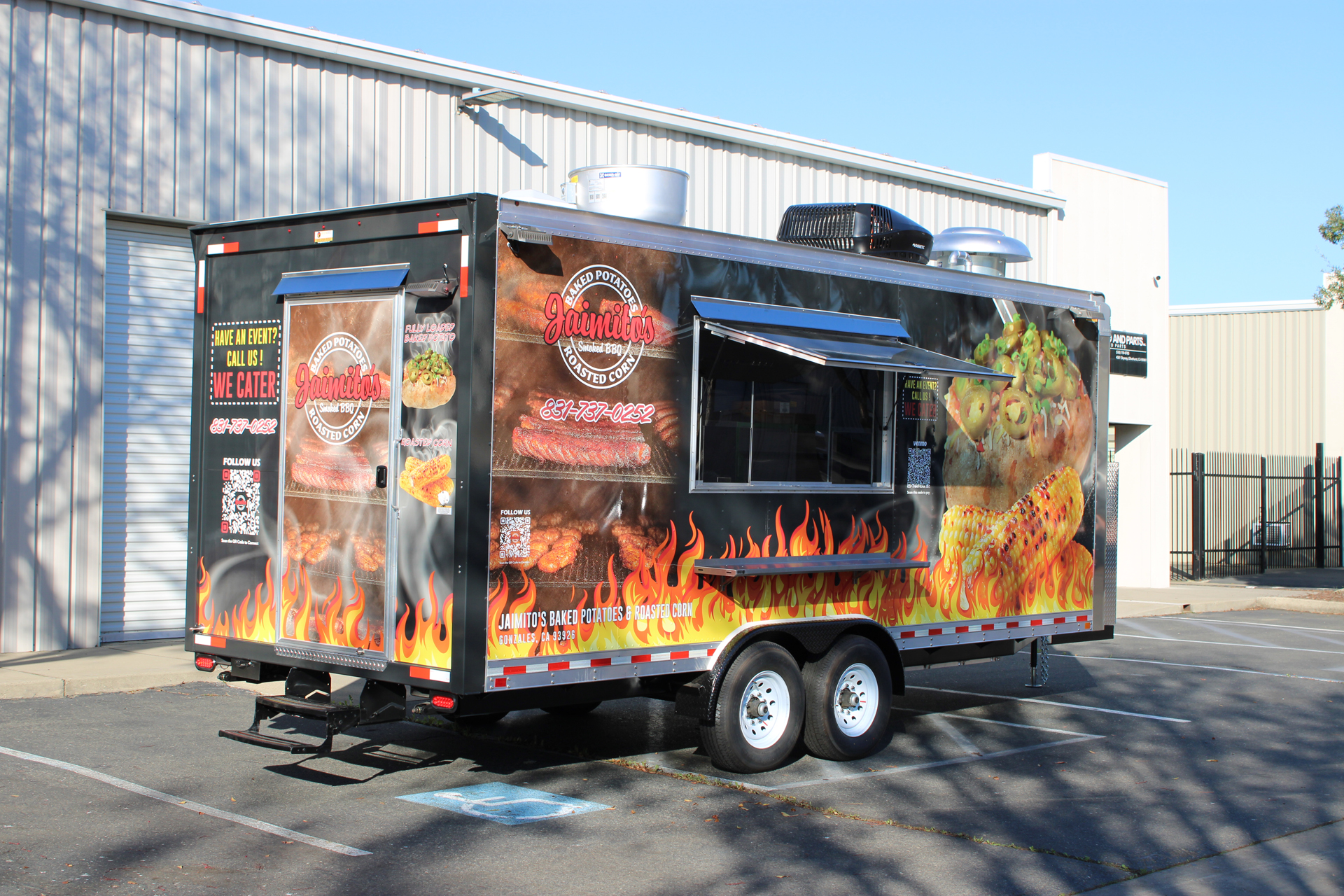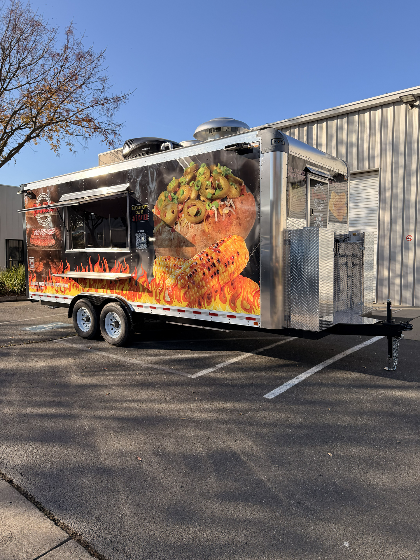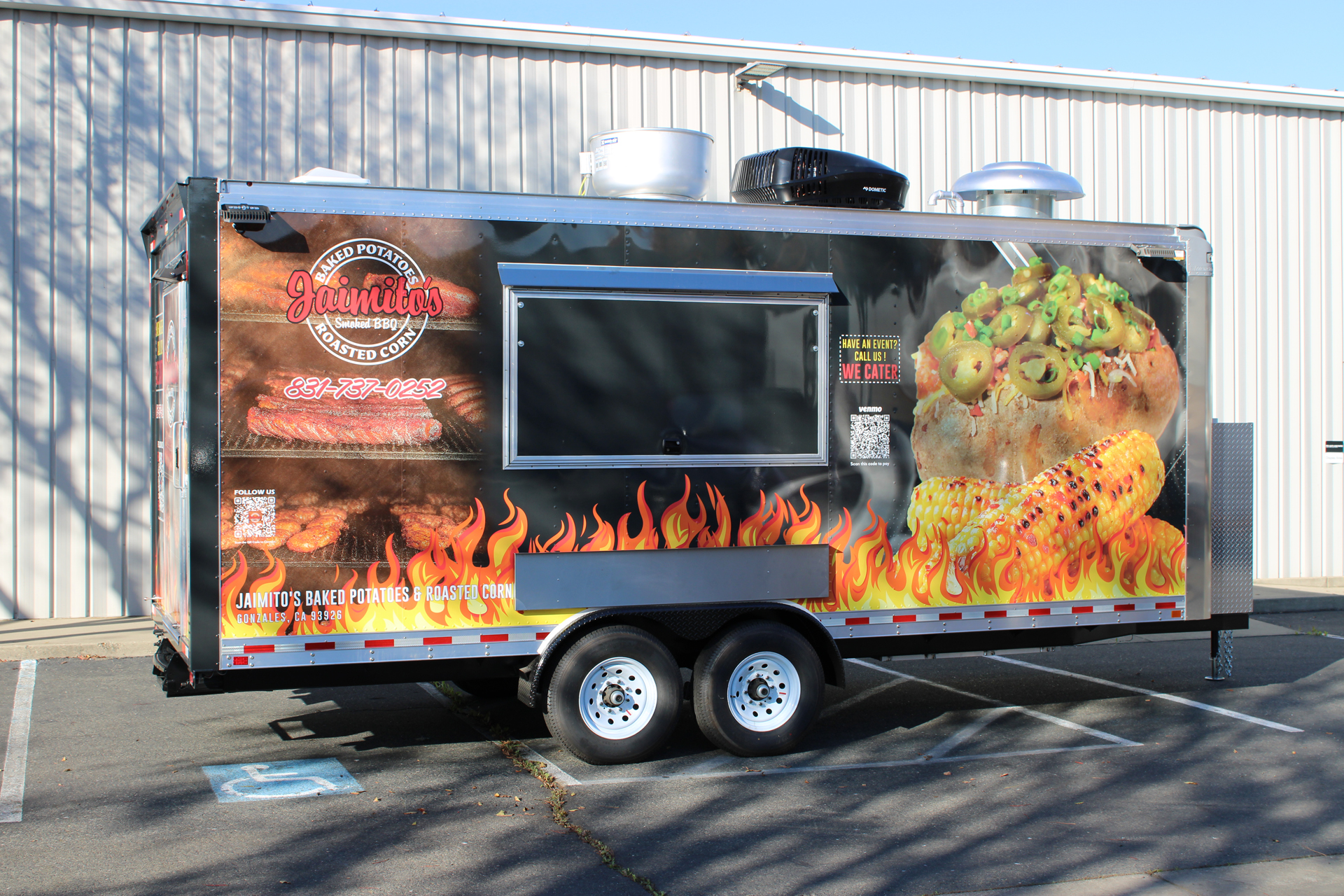 Golden State Trailers designed and built a custom 20 ft BBQ food trailer for Jaimito’s baked potatoes and roasted corn, engineered to support live BBQ cooking and smoker-based food preparation. This BBQ concession trailer is equipped with a commercial BBQ smoker, grilling surfaces, stainless steel prep tables, and refrigerated storage for ingredients. The layout was planned to safely handle smoke, heat, and continuous operation while maintaining efficient workflow during peak service hours.