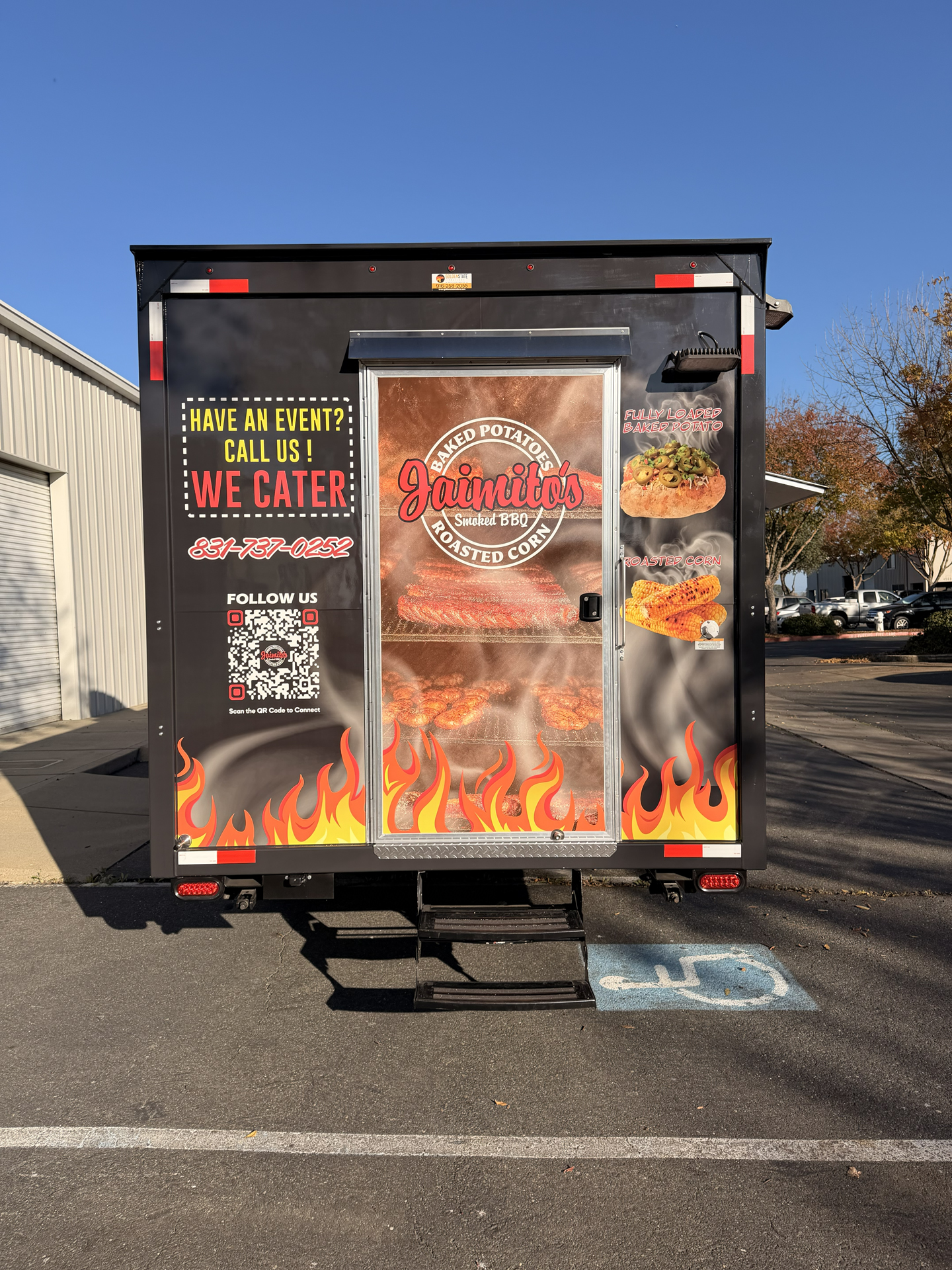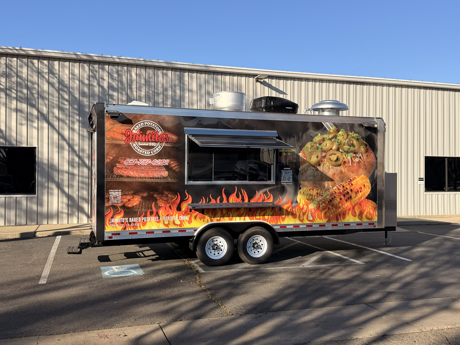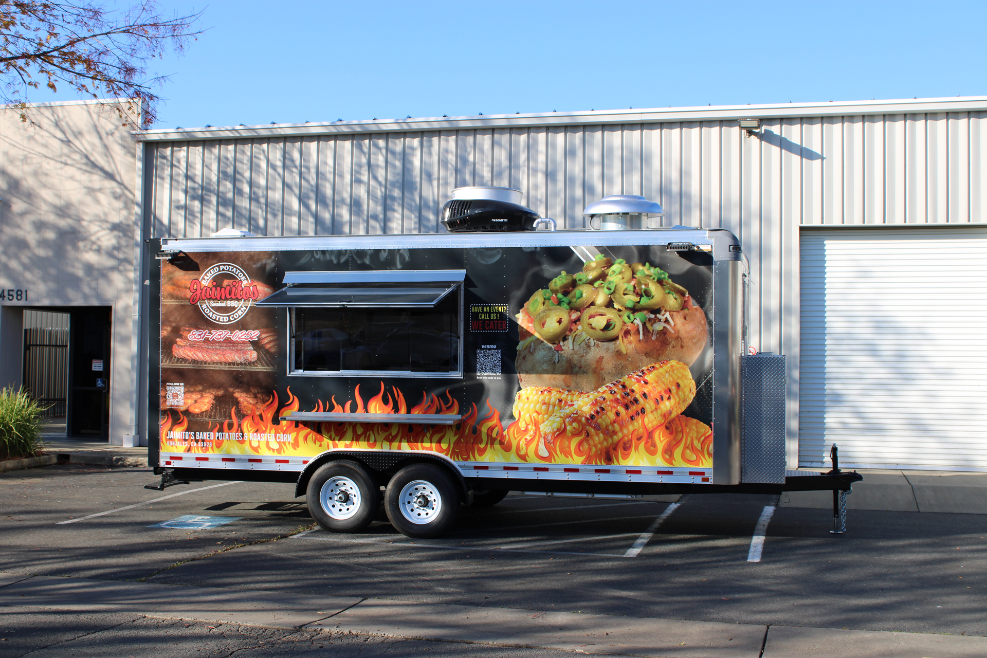 Golden State Trailers designed and built a custom 20 ft BBQ food trailer for Jaimito’s baked potatoes and roasted corn, engineered to support live BBQ cooking and smoker-based food preparation. This BBQ concession trailer is equipped with a commercial BBQ smoker, grilling surfaces, stainless steel prep tables, and refrigerated storage for ingredients. The layout was planned to safely handle smoke, heat, and continuous operation while maintaining efficient workflow during peak service hours.