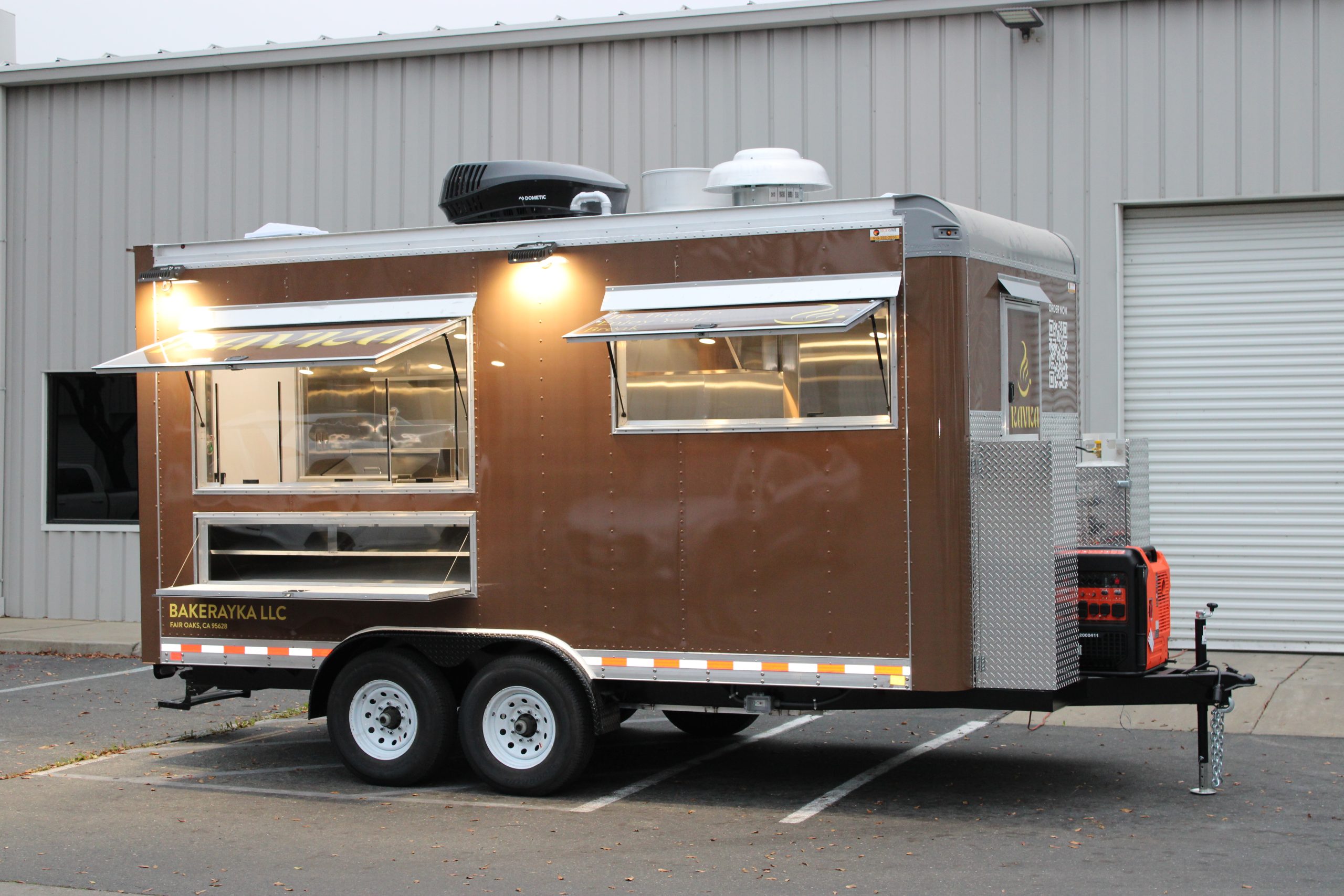 Golden State Trailers designed and built a custom 16 ft coffee trailer for Kavka, engineered exclusively for beverage and coffee service. This beverage and coffee trailer was configured with a commercial espresso machine setup, grinder space, refrigerated storage for milk and ingredients, stainless steel work surfaces, and dedicated hand-wash and utility systems. The layout supports fast drink preparation and smooth workflow during peak hours, making it ideal for daily service and mobile coffee operations.