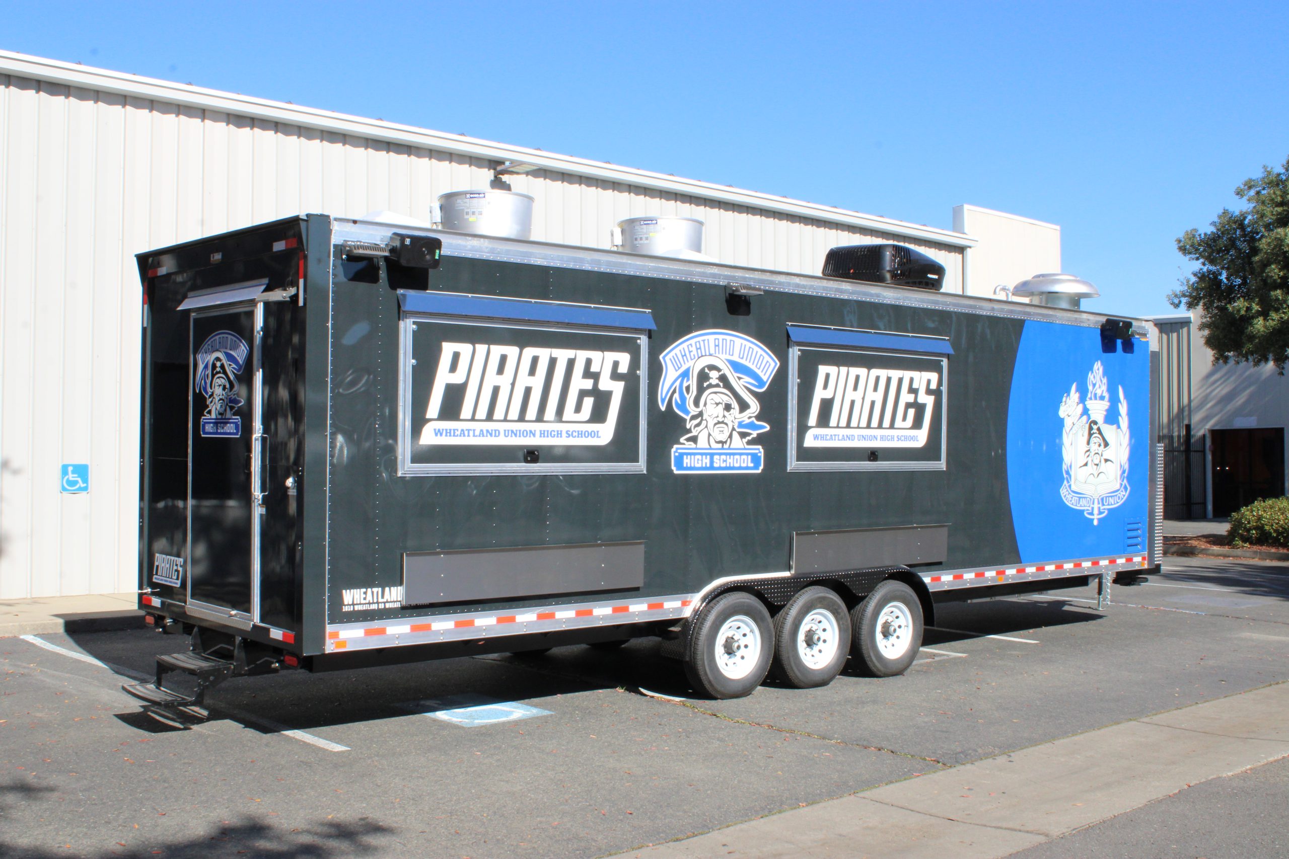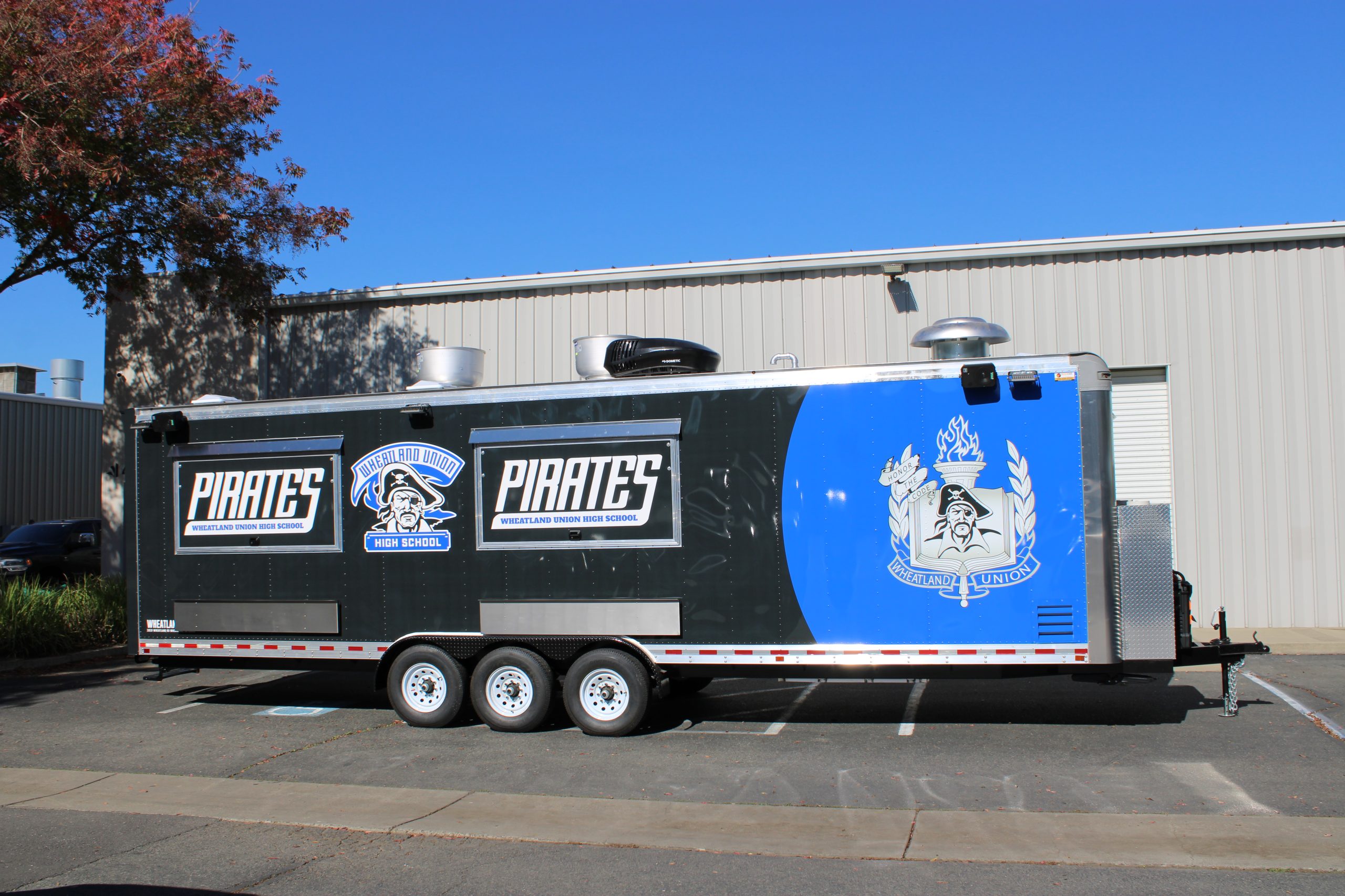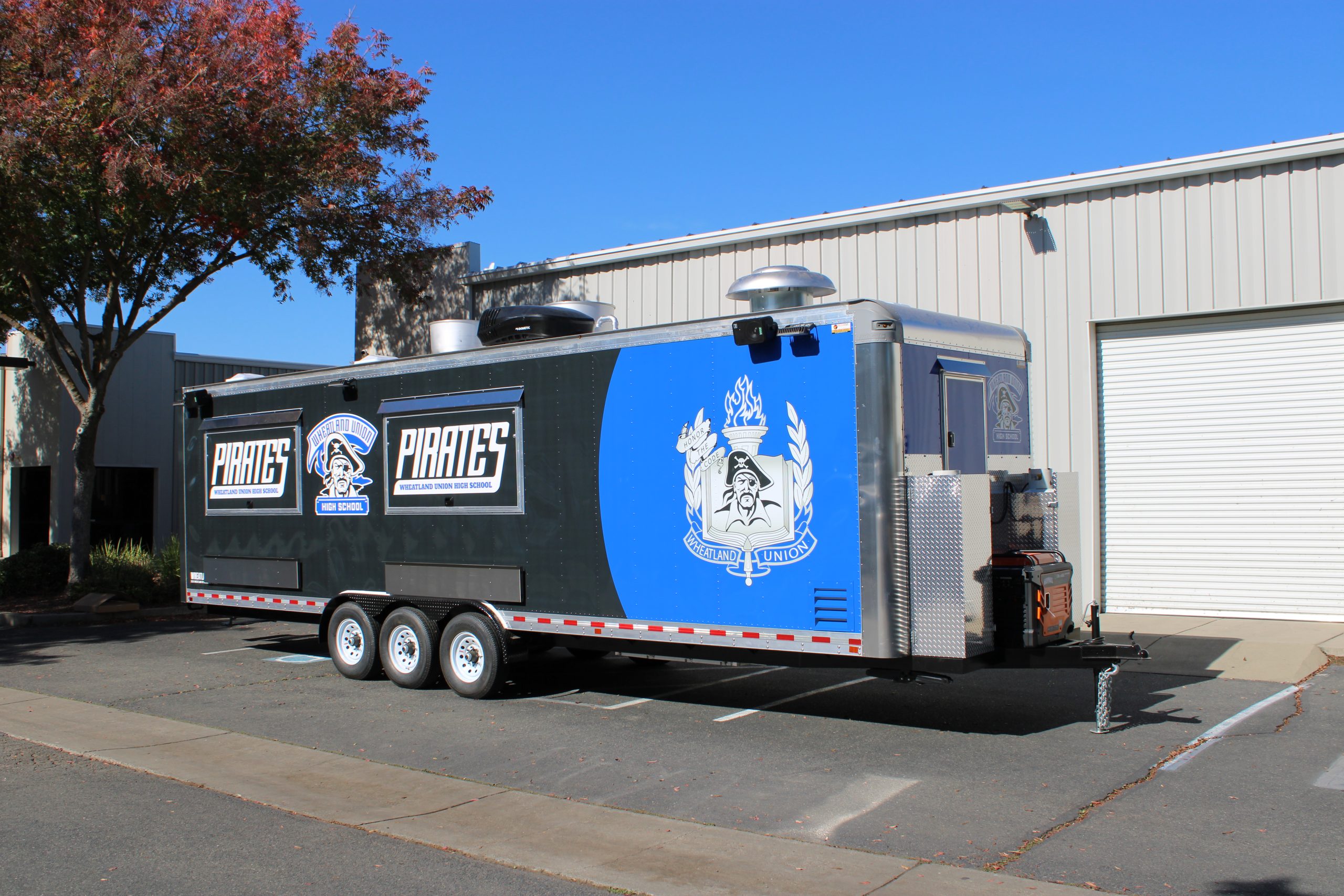Designed with a school-compliant layout and commercial-grade equipment, the trailer meets California health and fire code requirements while supporting consistent food service for large crowds. Custom exterior branding featuring the school’s Pirates identity was integrated into the wrap design, reinforcing school spirit and visibility at events. Schools and athletic programs interested in similar builds can get a project quote for a high-volume concession trailer designed specifically for games, tournaments, and campus events.