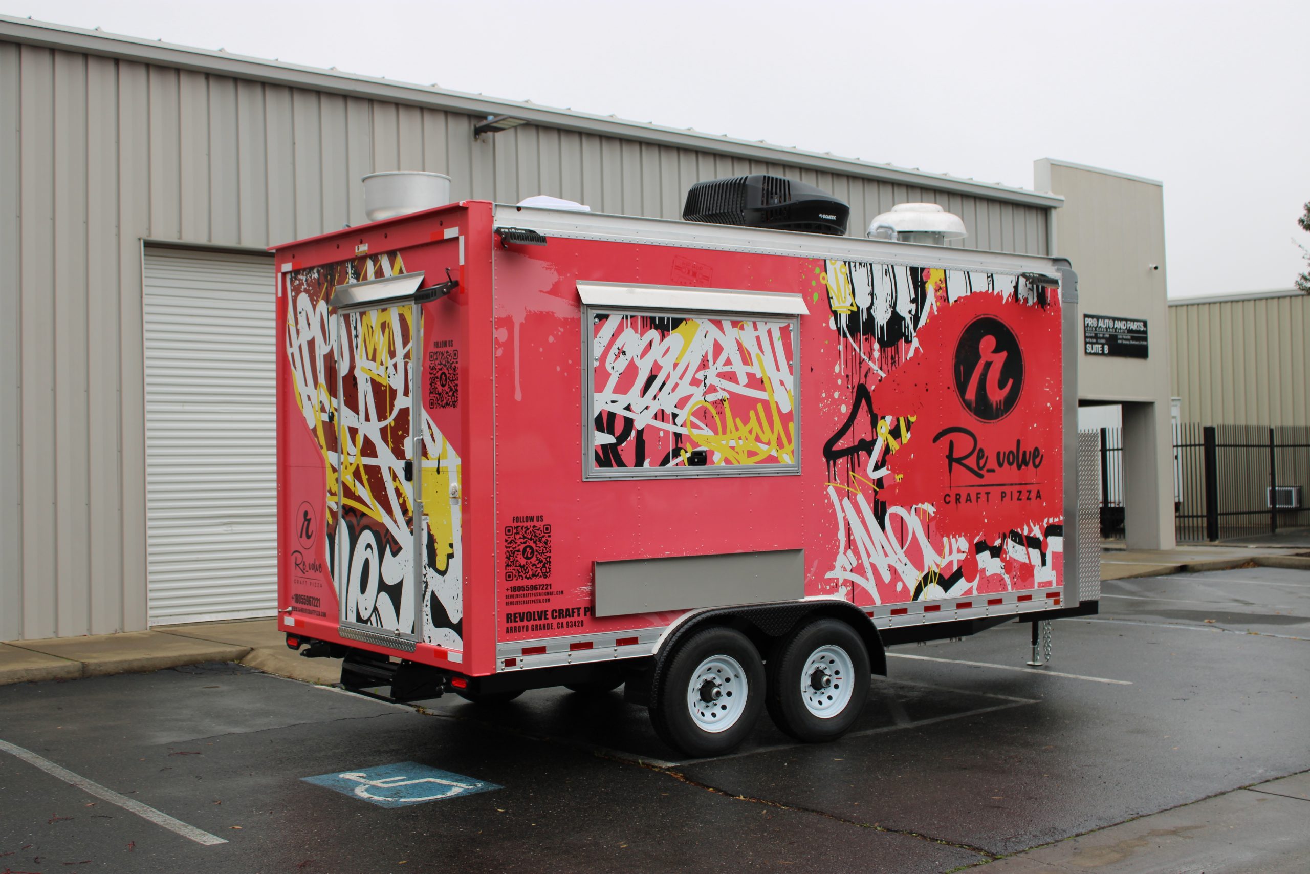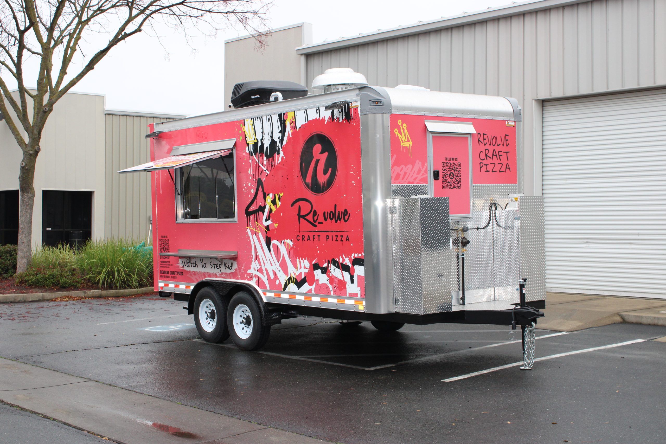 Golden State Trailers designed and built a custom 16 ft pizza food trailer for Revolve Craft Pizza, engineered for high-heat baking and continuous service. The pizza trailer layout includes a dedicated pizza oven trailer setup, stainless steel prep tables for dough stretching and topping assembly, refrigerated storage for ingredients, and dry storage for supplies. The workflow was planned to support fast order turnaround while maintaining safe clearance around high-temperature equipment.