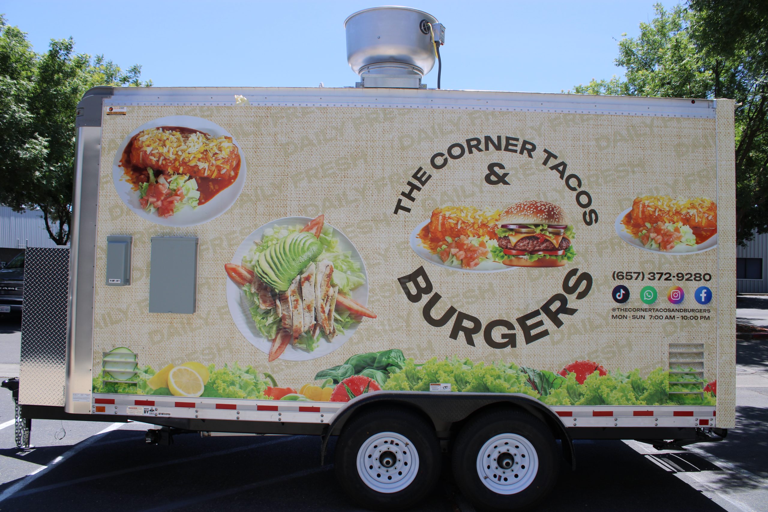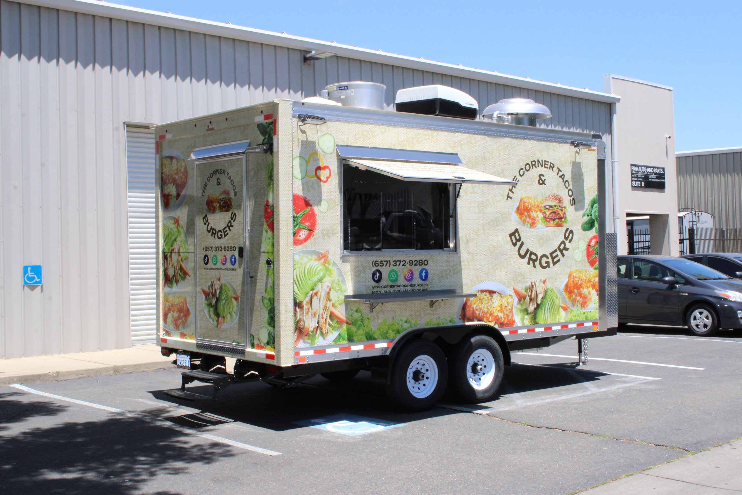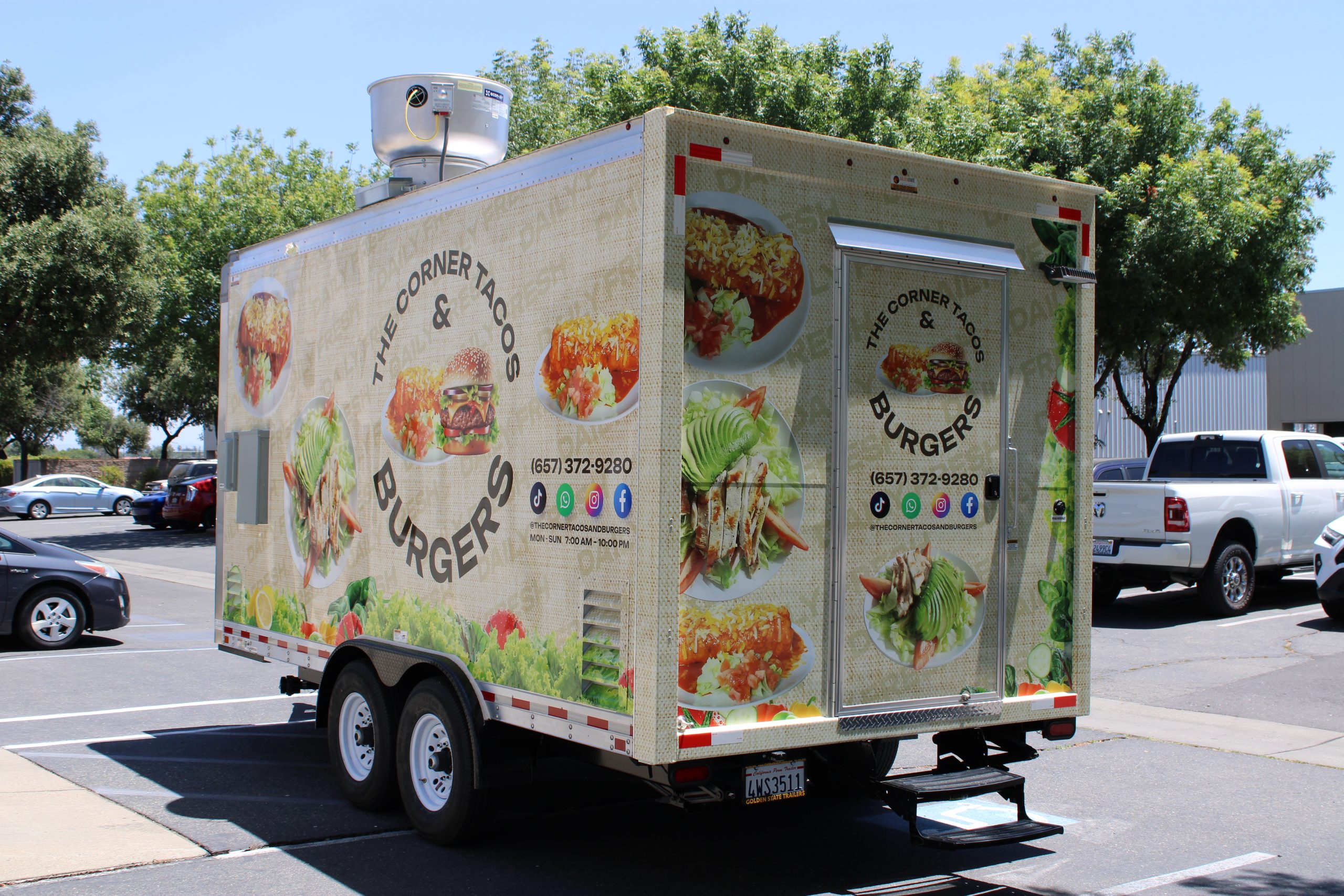 Golden State Trailers designed and built a 16ft Taco Food Trailer with an integrated Burger Food Trailer workflow for The Corner Tacos & Burgers.